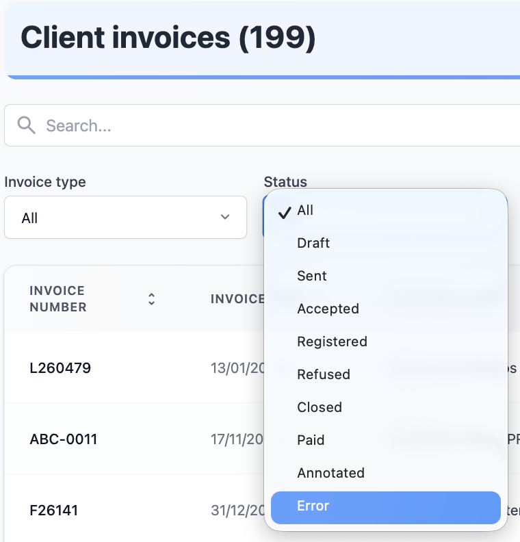 Client invoices list. The "error" status is now available in the status filter.